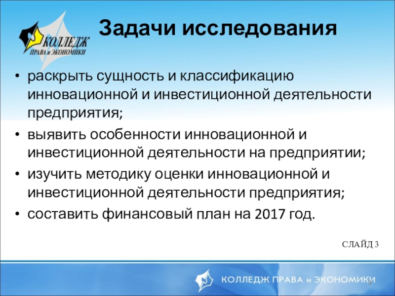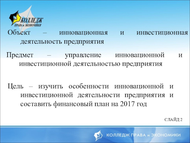 Цель – изучить особенности инновационной и инвестиционной деятельности предприятия и составить финансовый план на 2017 год