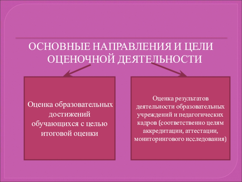 Оценка результатов деятельности образовательных учреждений и педагогических кадров (соответственно целям аккредитации, аттестации, мониторингового исследования)