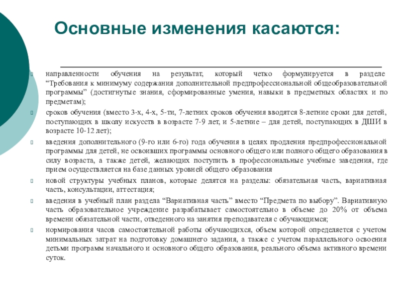 Основные изменения касаются:направленности обучения на результат, который четко формулируется в разделе  “Требования к минимуму содержания дополнительной