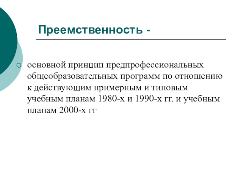 Преемственность - основной принцип предпрофессиональных общеобразовательных программ по отношению к действующим примерным и типовым учебным планам 1980-х и 1990-х гг. и учебным планам 2000-х гг