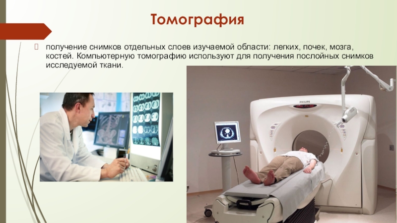 получение снимков отдельных слоев изучаемой области: легких, почек, мозга, костей. Компьютерную