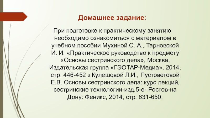 в учебном пособии Мухиной С. А., Тарновской И. И. «Практическое руководство к предмету «Основы сестринского дела», Москва, Издательская группа «ГЭОТАР-Медиа», 2014, стр. 446-452 и Кулешовой Л.И., Пустоветовой Е.В. Основы сестринского дела: курс лекций, сестринские технологии-изд.5-е- Ростов-на Дону: Феникс, 2014, стр. 631-650.
