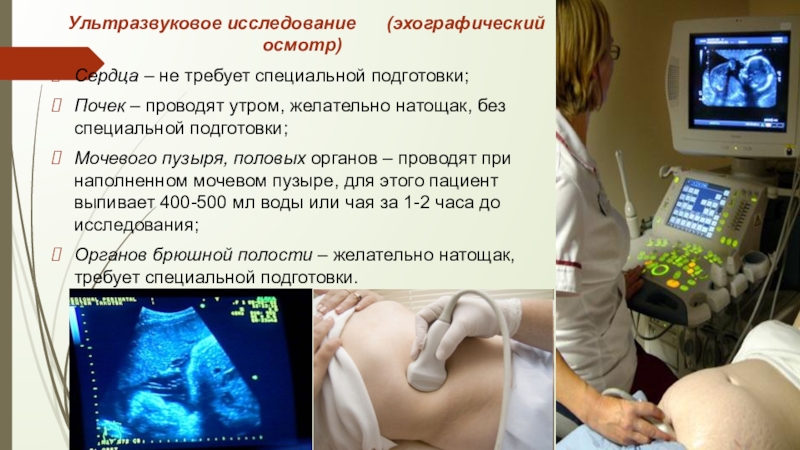 Мочевого пузыря, половых органов – проводят при наполненном мочевом пузыре, для этого пациент выпивает 400-500 мл воды или чая за 1-2 часа до исследования;