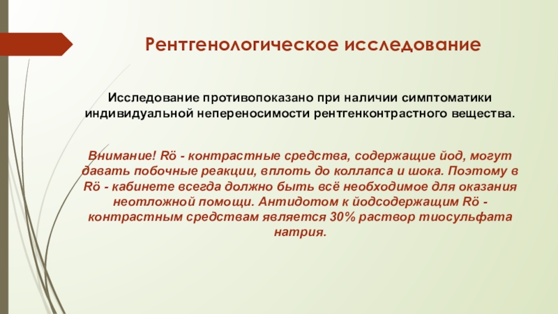 Rö - контрастные средства, содержащие йод, могут давать побочные реакции, вплоть до коллапса и шока. Поэтому в Rö - кабинете всегда должно быть всё необходимое для оказания неотложной помощи. Антидотом к йодсодержащим Rö - контрастным средствам является 30% раствор тиосульфата натрия.
