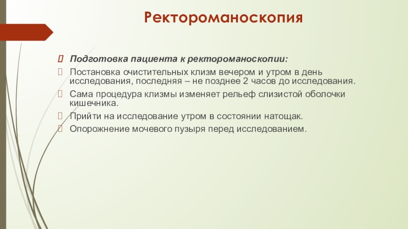 Постановка 2-3 очистительных клизм вечером и 2-3 утром в день исследования, последняя – не позднее 2 часов до исследования.