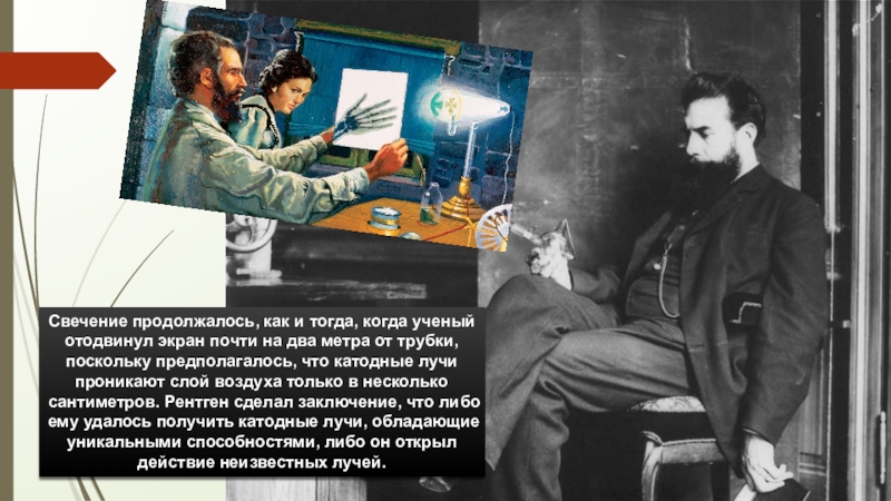 Слайд 10Свечение продолжалось, как и тогда, когда ученый отодвинул экран почти на