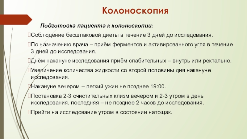 Соблюдение бесшлаковой диеты в течение 3 дней до