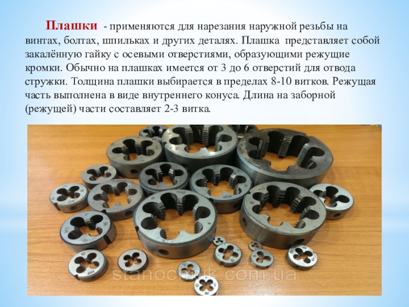 Слайд 6 Плашки - применяются для нарезания наружной резьбы на винтах, болтах, шпильках