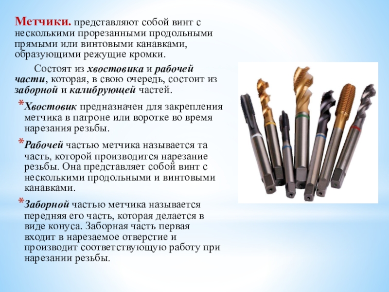 Слайд 3Метчики. представляют собой винт с несколькими прорезанными продольными прямыми или винтовыми