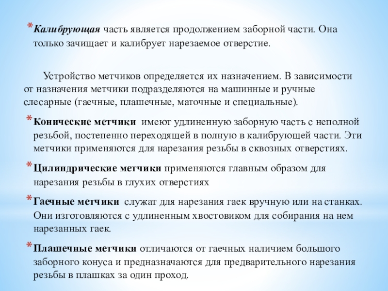 Конические метчики имеют удлиненную заборную часть с неполной резьбой, постепенно переходящей в полную в калибрующей части. Эти метчики применяются для нарезания резьбы в сквозных отверстиях.