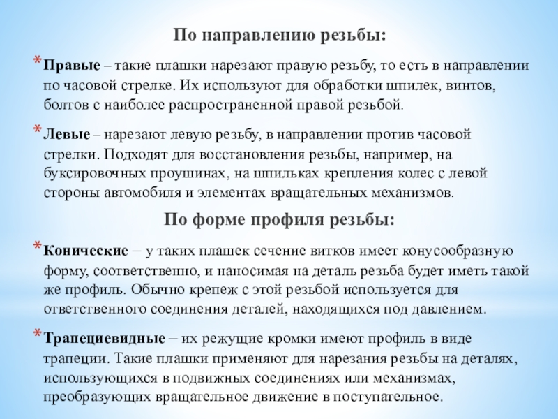 в направлении по часовой стрелке. Их используют для обработки шпилек, винтов, болтов с наиболее распространенной правой резьбой.