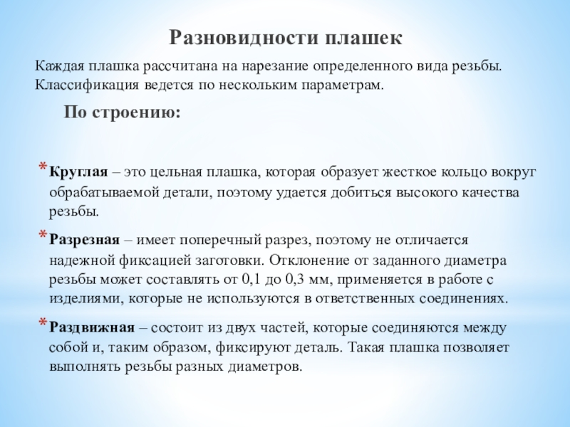 Каждая плашка рассчитана на нарезание определенного вида резьбы. Классификация ведется