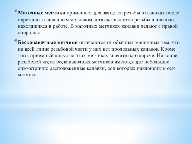 Слайд 5Маточные метчики применяют для зачистки резьбы в плашках после нарезания плашечным