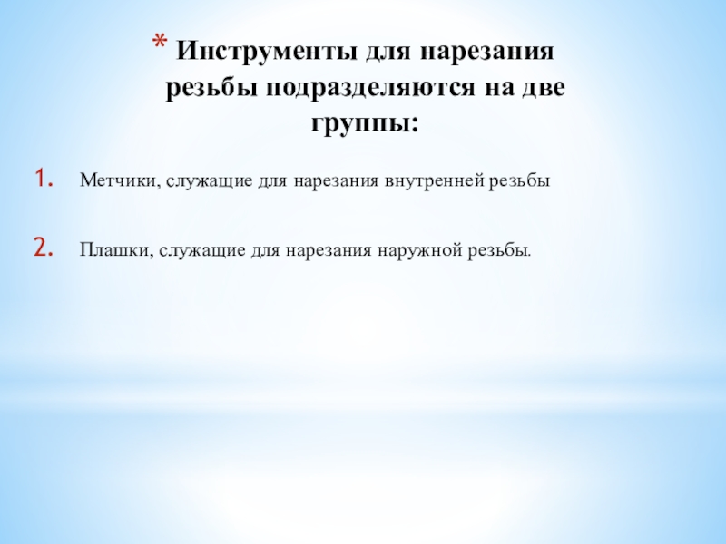 Слайд 2Инструменты для нарезания резьбы подразделяются на две группы: