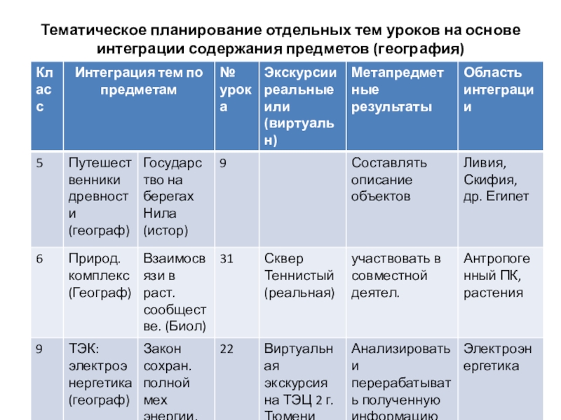 Слайд 23Тематическое планирование отдельных тем уроков на основе интеграции содержания предметов (география)