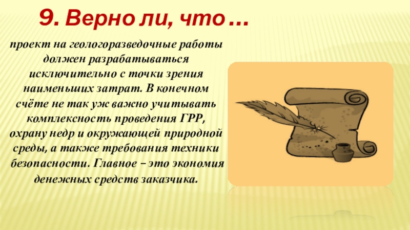 с точки зрения наименьших затрат. В конечном счёте не так уж важно учитывать комплексность проведения ГРР, охрану недр и окружающей природной среды, а также требования техники безопасности. Главное – это экономия денежных средств заказчика.