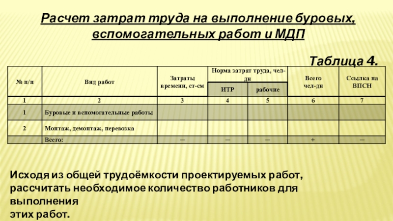 Слайд 35Расчет затрат труда на выполнение буровых, вспомогательных работ и МДП