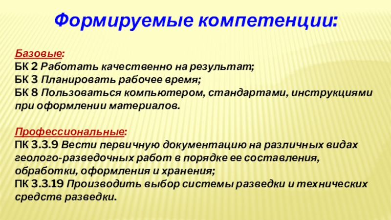 ПК 3.3.9 Вести первичную документацию на различных видах геолого-разведочных работ в порядке ее составления, обработки, оформления и хранения;