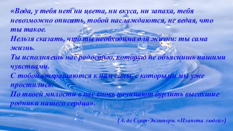 Слайд 3«Вода, у тебя нет ни цвета, ни вкуса, ни запаха, тебя