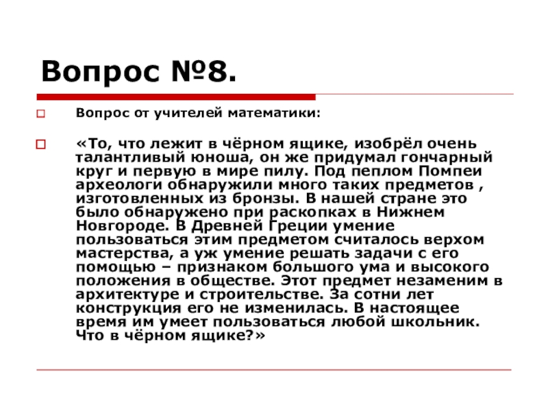 изобрёл очень талантливый юноша, он же придумал гончарный круг и первую в мире пилу. Под пеплом Помпеи археологи обнаружили много таких предметов , изготовленных из бронзы. В нашей стране это было обнаружено при раскопках в Нижнем Новгороде. В Древней Греции умение пользоваться этим предметом считалось верхом мастерства, а уж умение решать задачи с его помощью – признаком большого ума и высокого положения в обществе. Этот предмет незаменим в архитектуре и строительстве. За сотни лет конструкция его не изменилась. В настоящее время им умеет пользоваться любой школьник. Что в чёрном ящике?»