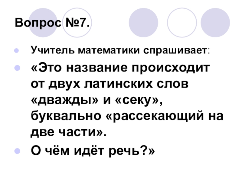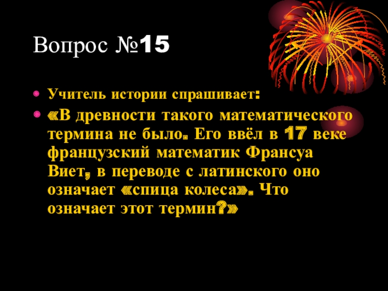 Его ввёл в 17 веке французский математик Франсуа Виет, в переводе с латинского оно означает «спица колеса». Что означает этот термин?»