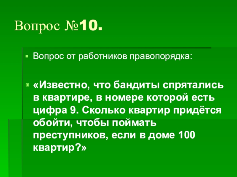 в номере которой есть цифра 9. Сколько квартир придётся обойти, чтобы поймать преступников, если в доме 100 квартир?»