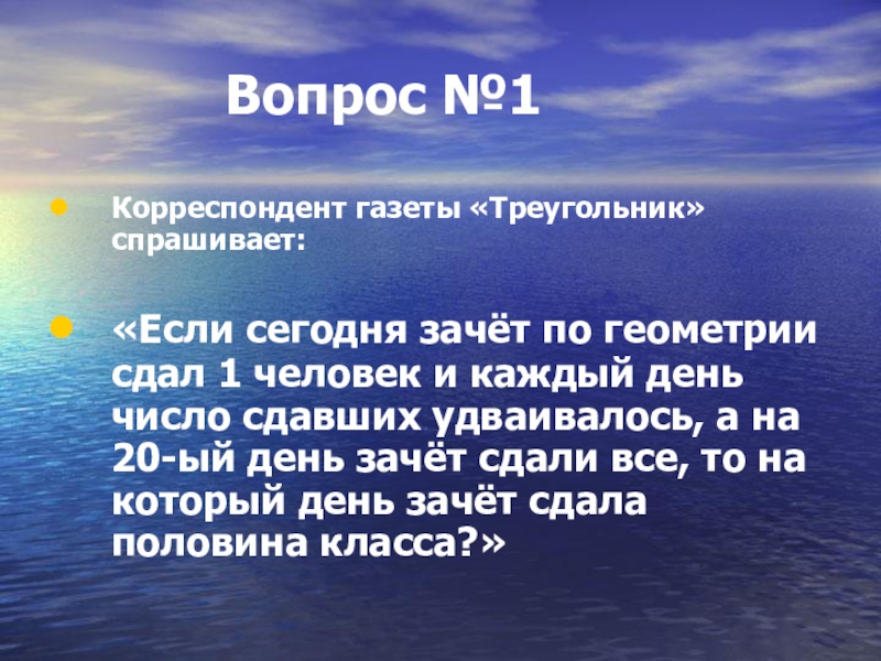 «Если сегодня зачёт по геометрии сдал 1 человек и каждый день число сдавших удваивалось, а на 20-ый день зачёт сдали все, то на который день зачёт сдала половина класса?»