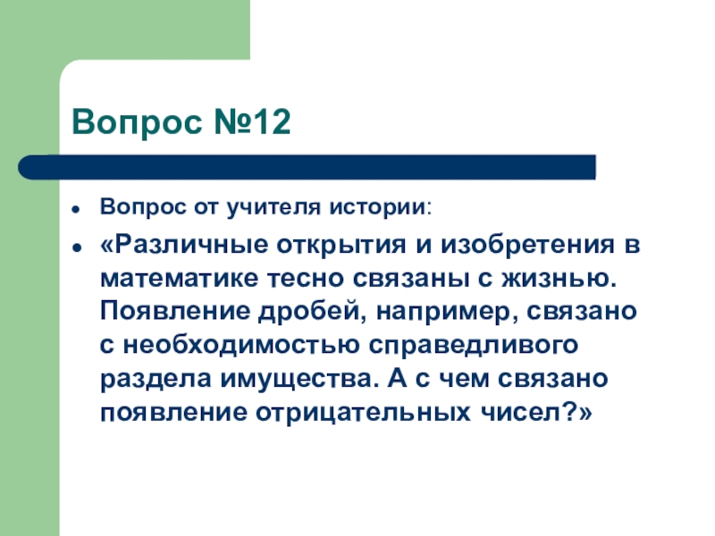 тесно связаны с жизнью. Появление дробей, например, связано с необходимостью справедливого раздела имущества. А с чем связано появление отрицательных чисел?»
