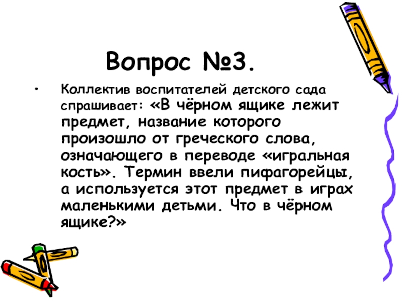 название которого произошло от греческого слова, означающего в переводе «игральная кость». Термин ввели пифагорейцы, а используется этот предмет в играх маленькими детьми. Что в чёрном ящике?»