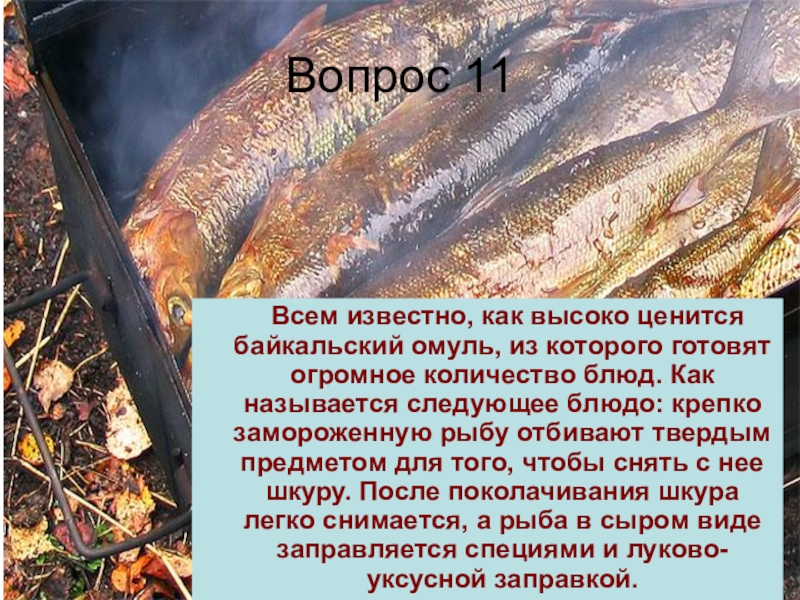 Вопрос 11	Всем известно, как высоко ценится байкальский омуль, из которого готовят огромное количество блюд. Как называется следующее