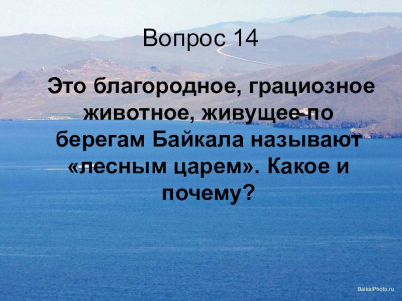 Вопрос 14	Это благородное, грациозное животное, живущее по берегам Байкала называют «лесным царем». Какое и почему?