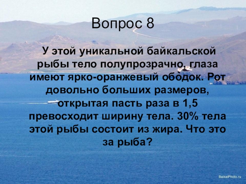 Вопрос 8	У этой уникальной байкальской рыбы тело полупрозрачно, глаза имеют ярко-оранжевый ободок. Рот довольно больших размеров, открытая