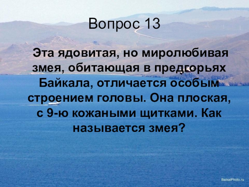 Вопрос 13	Эта ядовитая, но миролюбивая змея, обитающая в предгорьях Байкала, отличается особым строением головы. Она плоская, с