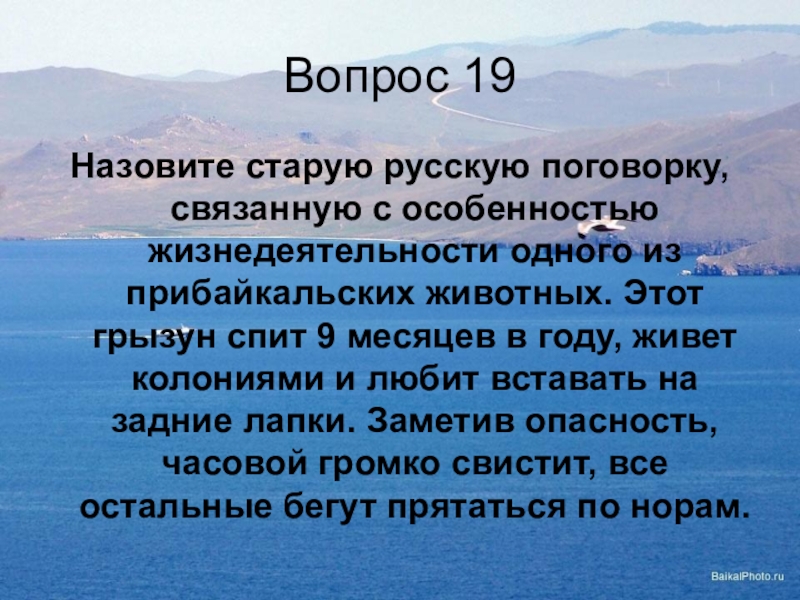 Вопрос 19Назовите старую русскую поговорку, связанную с особенностью жизнедеятельности одного из прибайкальских животных. Этот грызун спит 9
