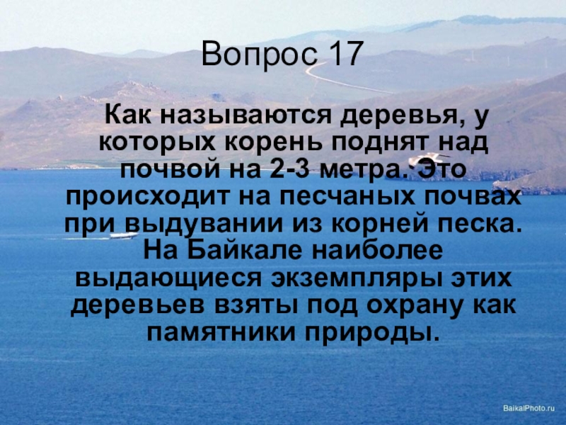 Вопрос 17	Как называются деревья, у которых корень поднят над почвой на 2-3 метра. Это происходит на песчаных