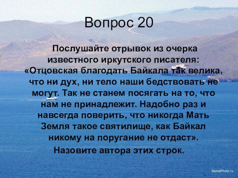 Вопрос 20	Послушайте отрывок из очерка известного иркутского писателя: «Отцовская благодать Байкала так велика, что ни дух, ни