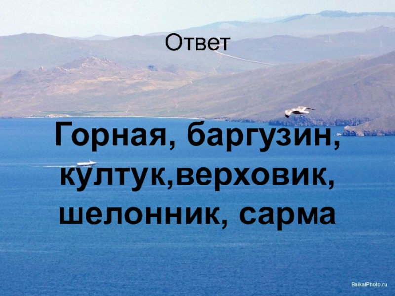 Слайд 13Ответ Горная, баргузин, култук,верховик, шелонник, сарма