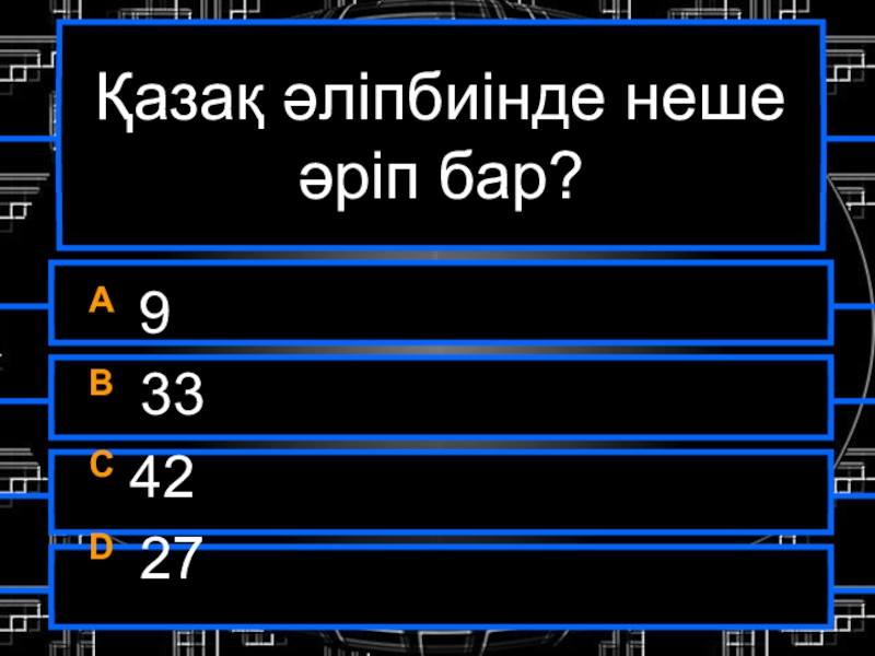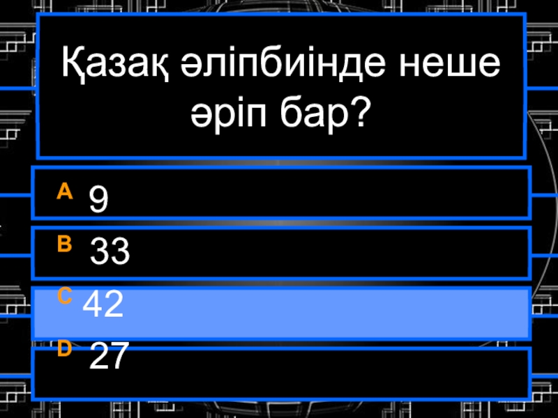 Қазақ әліпбиінде неше әріп бар?A 9B 33C 42D 27