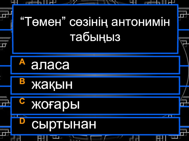 “Төмен” сөзінің антонимін табыңызA аласаB жақынC жоғарыD сыртынан
