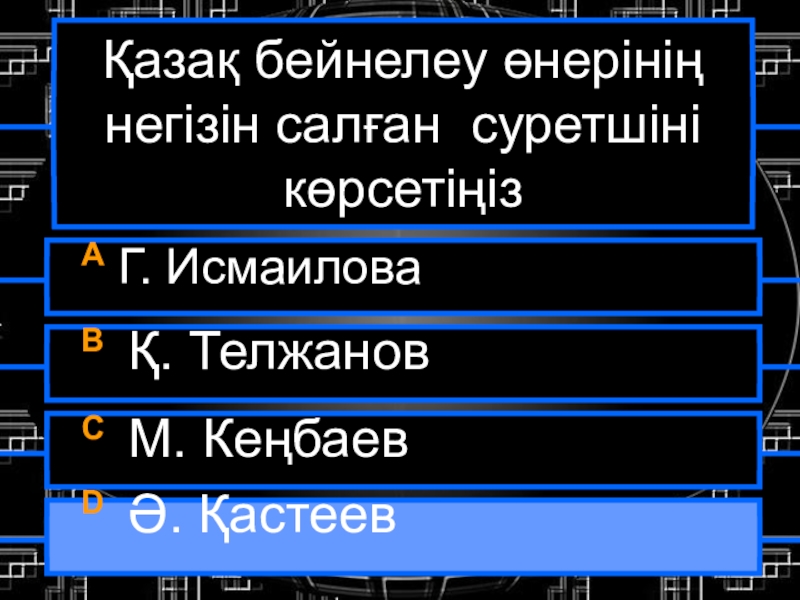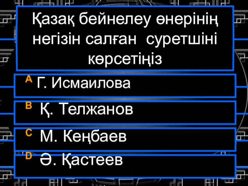 Қазақ бейнелеу өнерінің негізін салған суретшіні көрсетіңізА Г. ИсмаиловаB Қ. ТелжановC М. КеңбаевD Ә. Қастеев