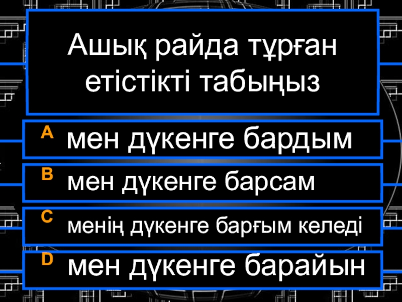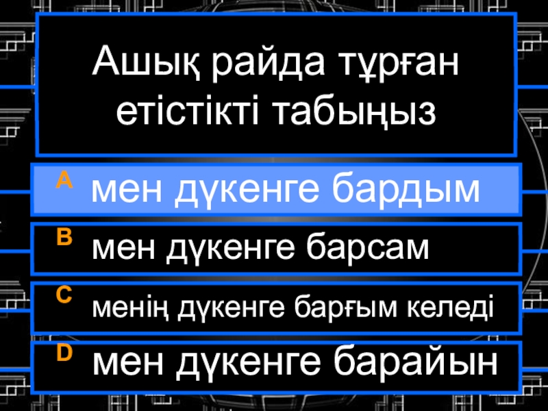 Ашық райда тұрған етістікті табыңызA мен дүкенге бардымB мен дүкенге барсамC менің дүкенге барғым келедіD мен дүкенге