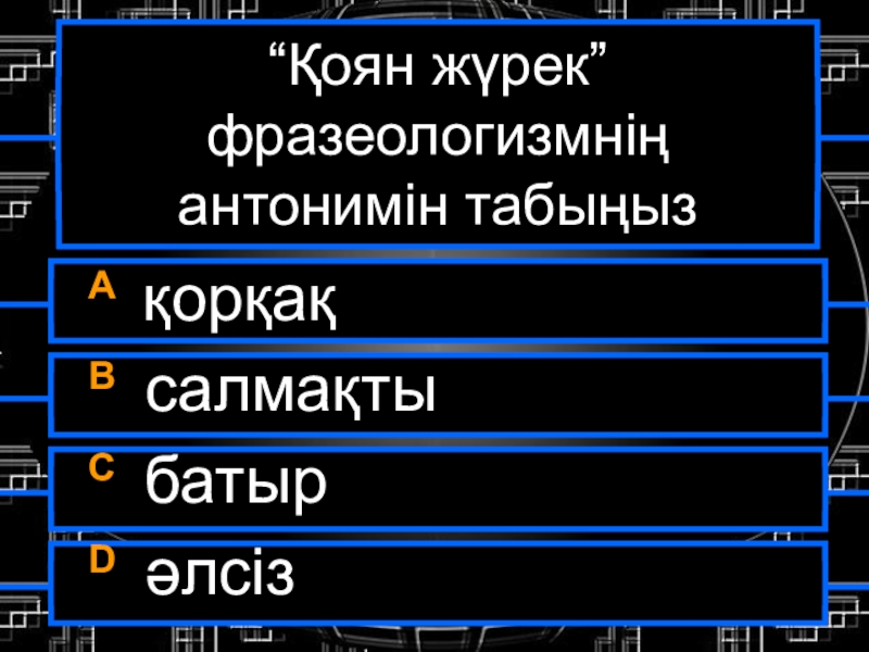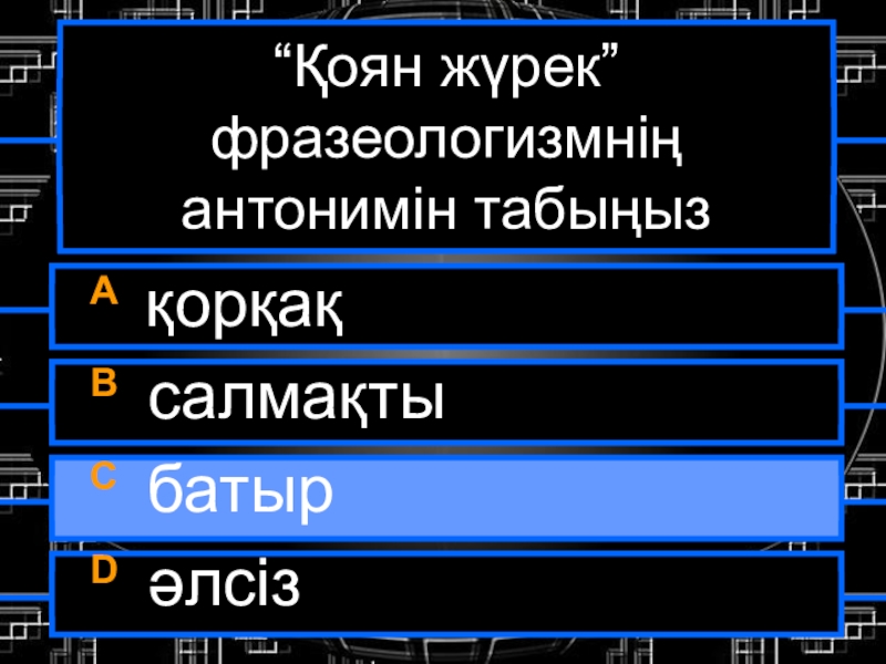 “Қоян жүрек” фразеологизмнің антонимін табыңызA қорқақB салмақтыC батырD әлсіз
