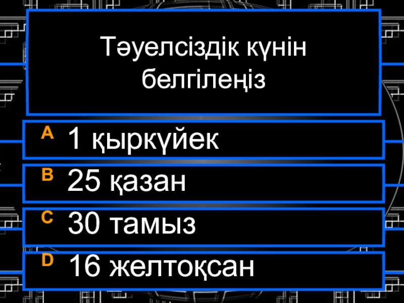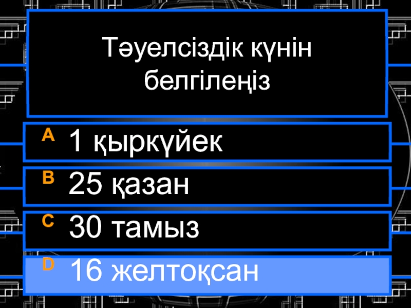 Тәуелсіздік күнін белгілеңізA 1 қыркүйекB 25 қазанC 30 тамызD 16 желтоқсан