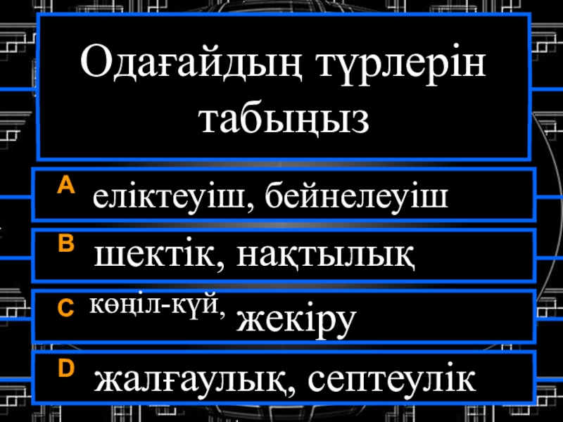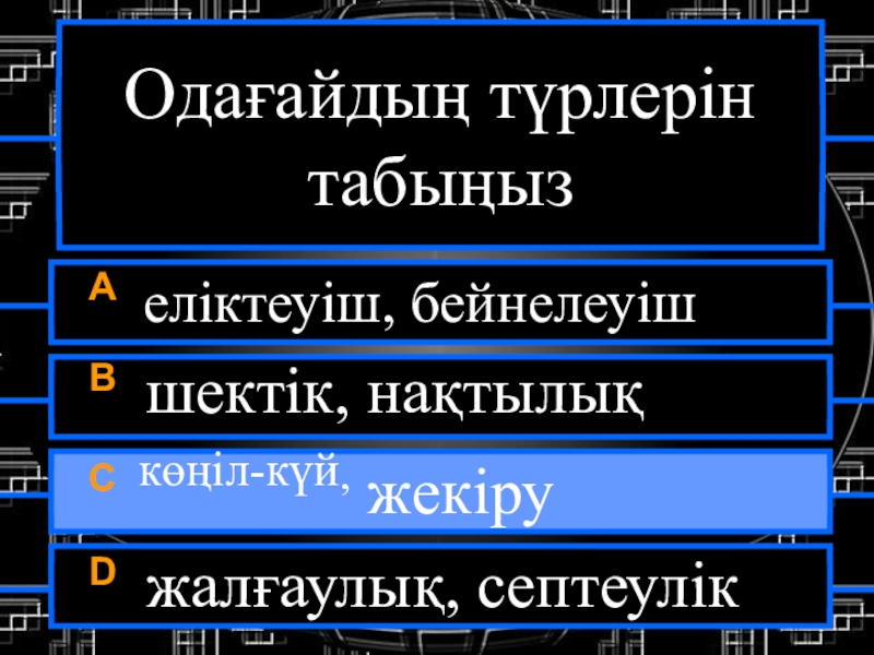 Одағайдың түрлерін табыңызA еліктеуіш, бейнелеуішB шектік, нақтылықC көңіл-күй, жекіруD жалғаулық, септеулік