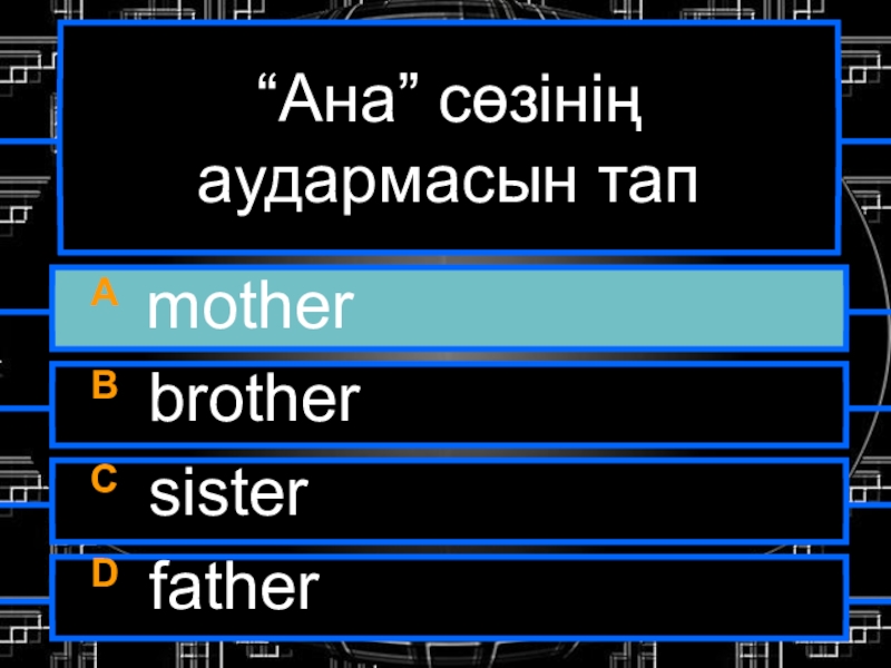 “Ана” сөзінің аудармасын тапA motherB brotherC sisterD father