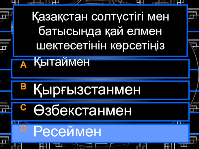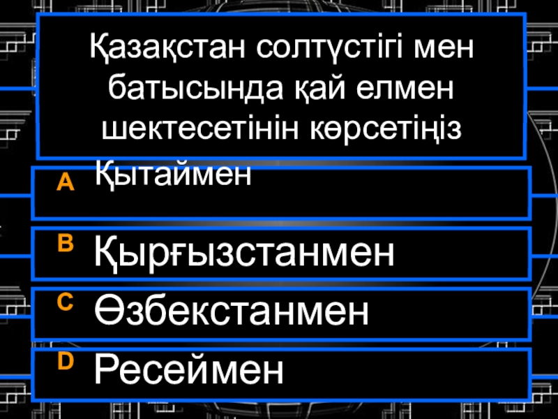 Қазақстан солтүстігі мен батысында қай елмен шектесетінін көрсетіңізA  ҚытайменB ҚырғызстанменC ӨзбекстанменD Ресеймен