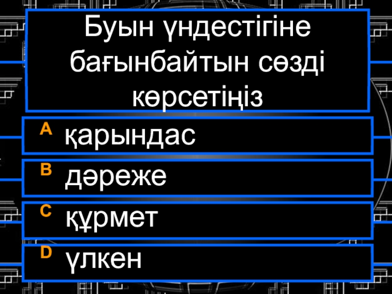 Буын үндестігіне бағынбайтын сөзді көрсетіңізA қарындасB дәрежеC құрметD үлкен