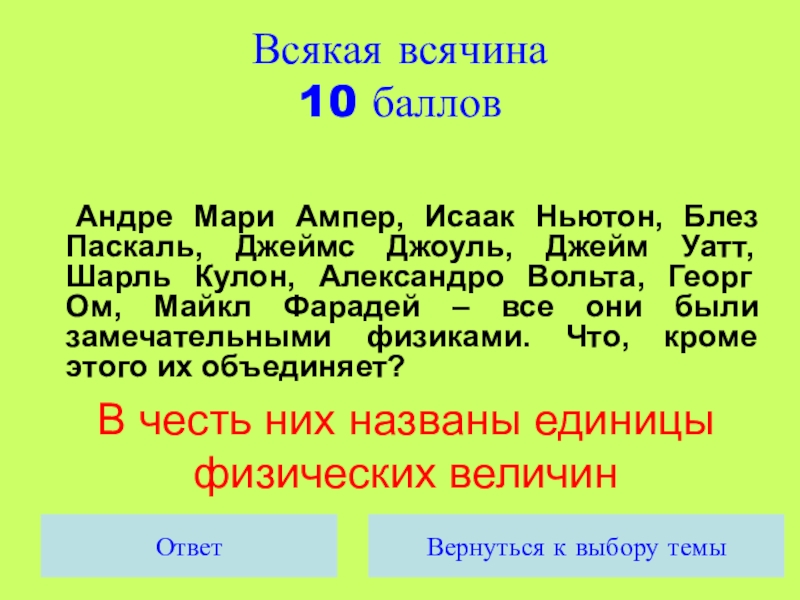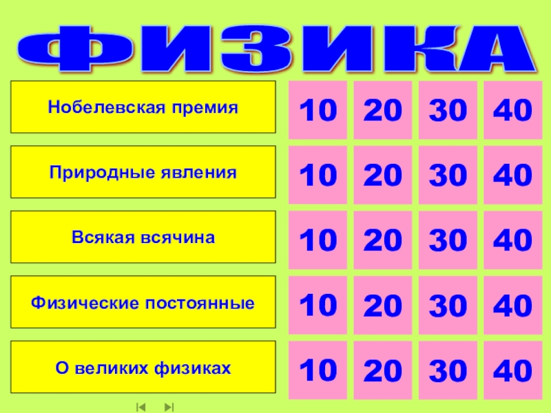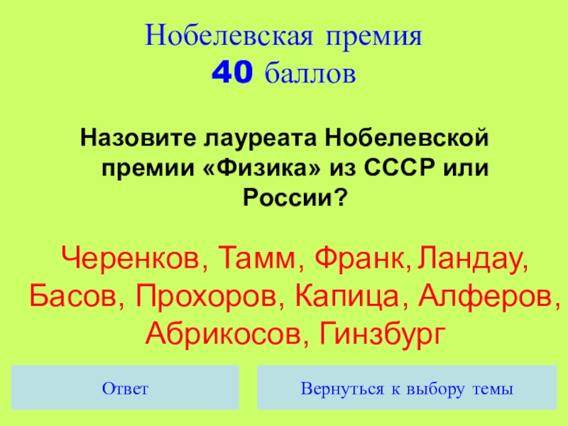 Черенков, Тамм, Франк, Ландау, Басов, Прохоров, Капица, Алферов, Абрикосов, Гинзбург
