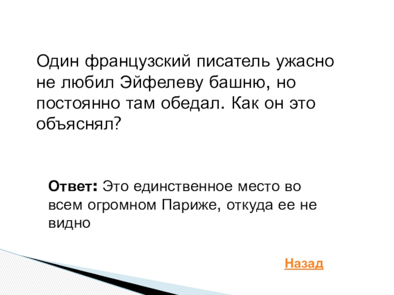 Ответ: Это единственное место во всем огромном Париже, откуда ее не видно