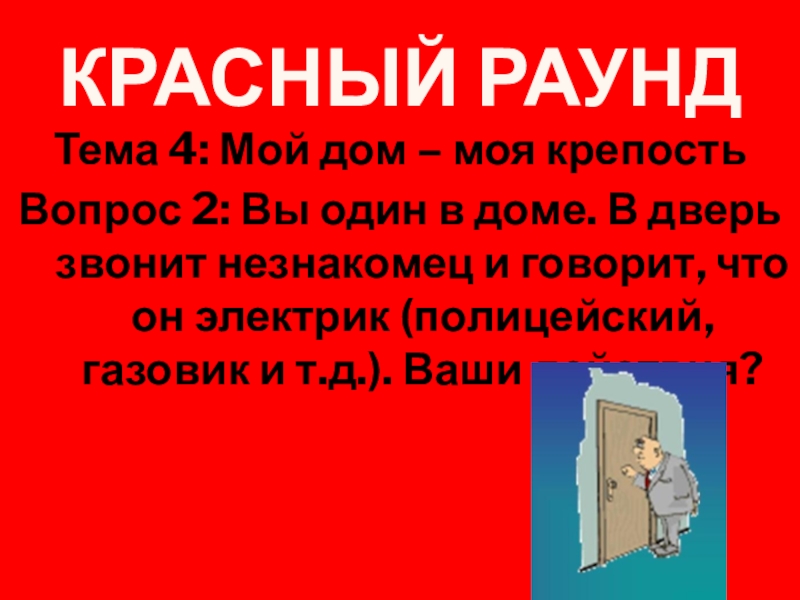 в доме. В дверь звонит незнакомец и говорит, что он электрик (полицейский, газовик и т.д.). Ваши действия?
